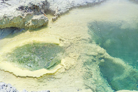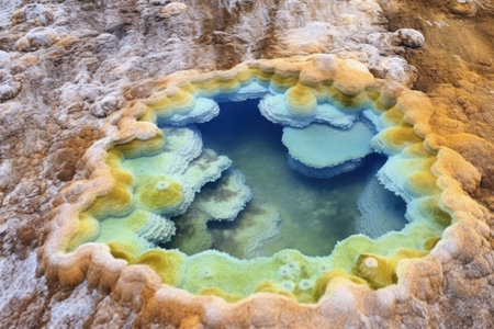 yellow sulfur deposits surrounding a hot spring, created with generative ai