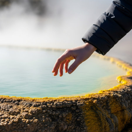 A woman stands at the edge of a steaming blue hot spring, surrounded by natural beauty and tranquility.