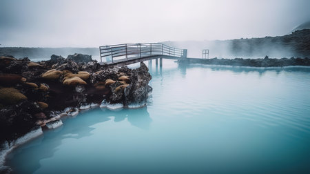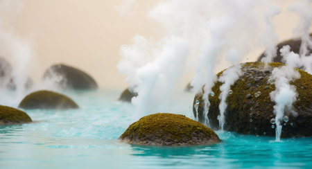 A captivating view of natural hot springs with serene blue waters surrounded by rocky formations and gentle steam rising, offering a peaceful retreat.