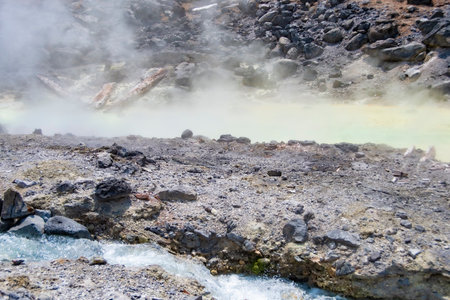 Clear blue sky and sulfur gas steaming out from ground at Noboribetsu Jigokudani or Hell Valley in Hokkaido, Japan