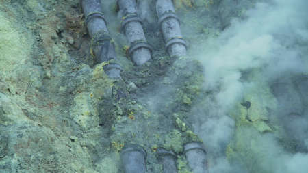 Extraction of sulfur in the crater of a volcano. Sulfur gas, smoke. Kawah Ijen, crater with acidic crater lake where sulfur is mined. Ijen volcano complex is a group of stratovolcanoes in the Banyuwangi Regency of East Java, Indonesia.