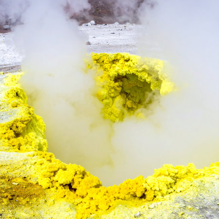 A close-up view captures the raw, primordial power of the Earth. Billowing clouds of hot steam and gas rise from a geothermal vent, surrounded by vibrant yellow sulfur crystal deposits.