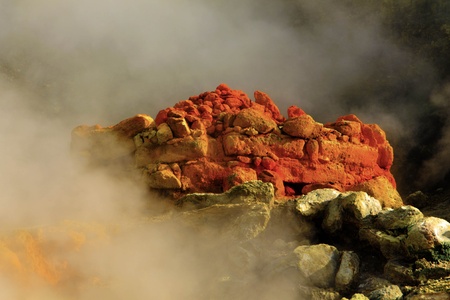 Closeup of The red clay turns hot as super heated sulphur gas comes to the surface at geothermal area Hverir.