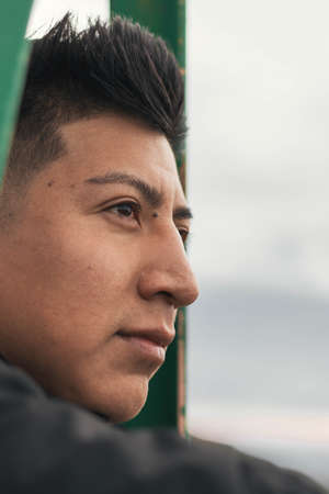 Portrait of happy handsome smiling young Asian man , posing outdoor.