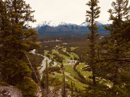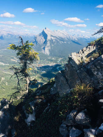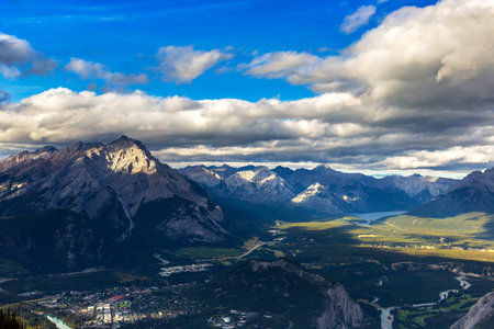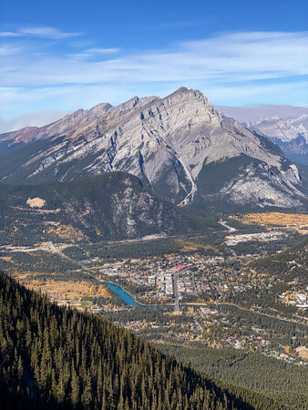 Beautiful view of Banff resort town with Mount Rundle, Goatview Peak, and Sulphur Mountain towering above the resort town, from Banff Viewpoint, Mount Norquay, Alberta, Canada