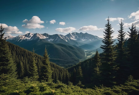 Mountain forest landscape under blue sky and white clouds