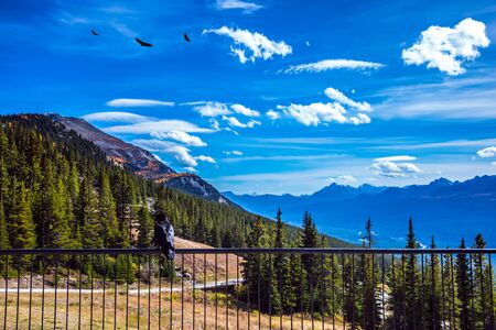 The observation deck, fenced with a lattice, for tourists' rest. Magnificent snow-capped Rocky Mountains. Canada. Beautiful autumn day. Concept of active and ecological tourism