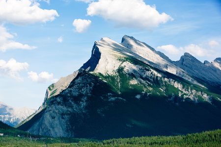 Rundle mountain with peaks in full sun against a bright blue sky.