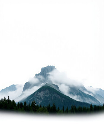 Mountain range landscape with forest and fog on white background with copyspace