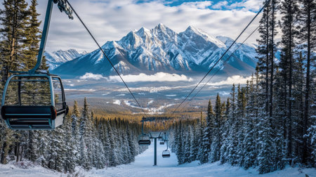 From a cozy chairlift, snow-covered peaks rise majestically in the background, creating a stunning backdrop for winter adventures and serene nature.