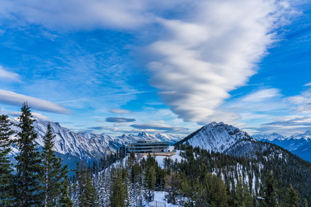 Stunning view of Sulphur mountain in Banff national park with snow covered pine forest and wooden boardwalks leading to summit in Alberta, Canada