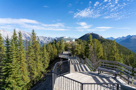 AB, Canada-OCT 31 2020: Banff Gondola summit station. Wooden stairs and boardwalks along the summit. Banff National Park, Canadian Rockies.