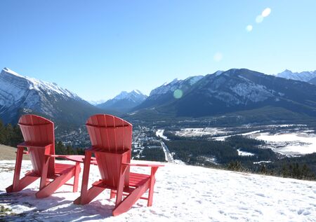 Overlook view Town of Banff in snowy winter season. Snow Capped Mount Rundle, Sulphur Mountain in background. View from Mount Norquay Banff View Point. Banff National Park, Canadian Rockies, Canada.