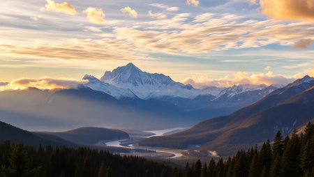 Majestic mountains tower over a serene spruce forest beneath a dramatic sky, showcasing nature beauty at dusk. Towering mountains with rolling hills and moody sky highlighting peaceful wilderness. AI.