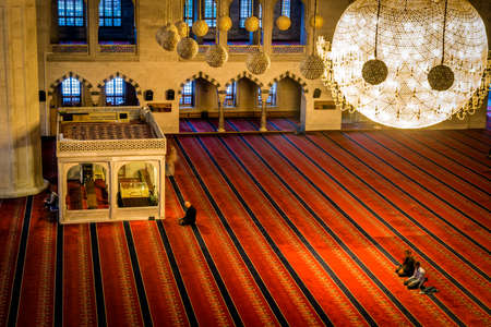 Ankara, Turkey - October 23, 2015: Kocatepe mosque interior in the evening. Preyers in the mosque. Photography of slow shutter spead.