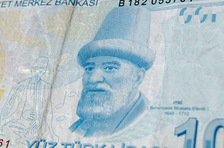 A used 100 Turkish Lira banknote showing the composer Buhurizade Mustafa Itri. Banknote photographed at an angle.