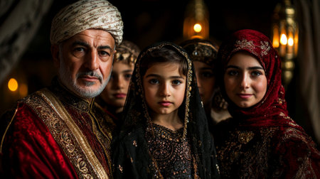 Family members gather in their home dressed in beautiful traditional attire for Eid surrounded decorative lanterns and rich gold accents enhance festive atmosphere.