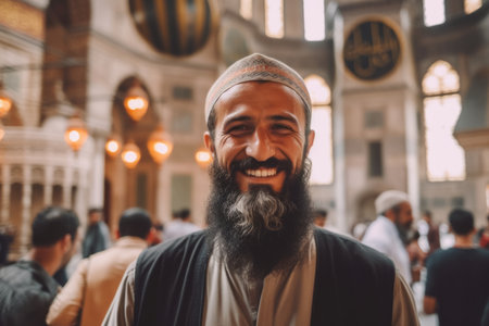 Handsome bearded man with long beard and mustache in turkish clothes posing in the mosque