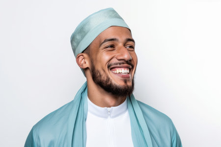 Portrait of a happy muslim man smiling at camera over white background