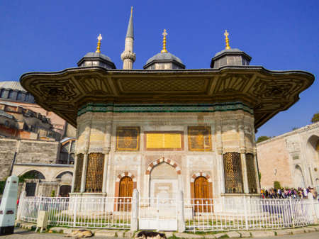 Istanbul, Turkey - October 30, 2019: View of the Sultan Ahmet III (Turkish: Sultan Ahmet Cesmesi) near the Hagia Sophia Museum.