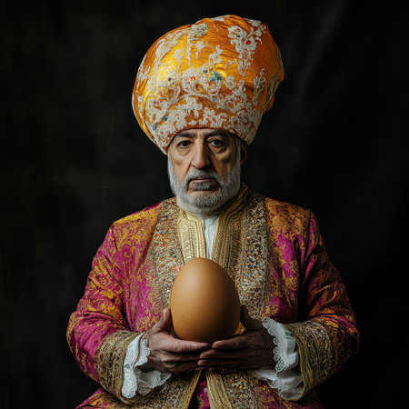 A man with a regal appearance sits calmly dressed in a richly adorned outfit while holding a large egg in his hands.