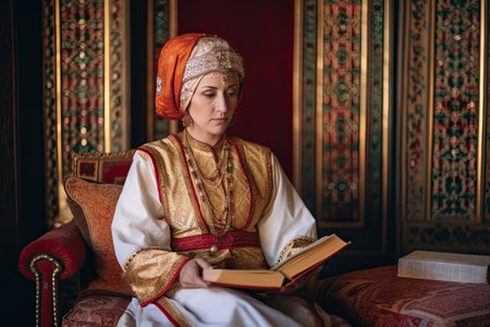 the bride in her traditional wedding dress and headpiece, sitting on an ornate chair reading a book with red background. Generative Ai