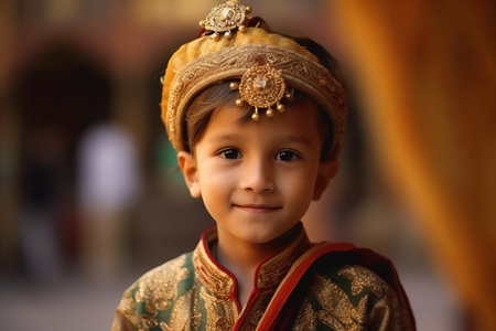 Portrait of a cute little boy in traditional costume at the temple