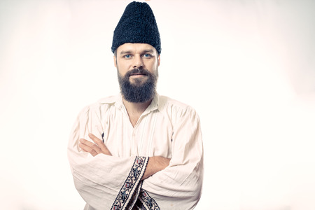 young man wearing traditional romanian costume on white background