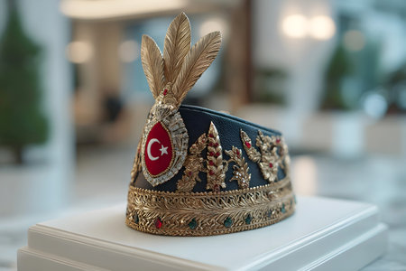 Decorative ceremonial hat adorned with golden embroidery, jewels, feathers and Turkish national emblem displayed