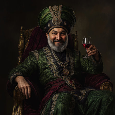 Caucasian mature male nobleman in ornate attire with wine glass.