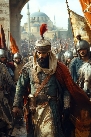 In a historic scene the Turkish Sultan leads a grand procession through the streets of Constantinople following its conquest. Accompanied by soldiers the atmosphere is filled with triumph.