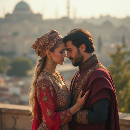 Portrait of a loving couple on the roof of an ancient building