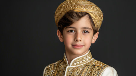 Portrait of happy young muslim child in traditional dress with a dark background and text space
