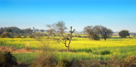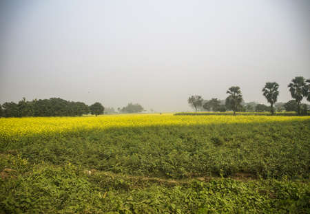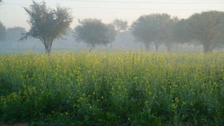 Yellow dormant Mustard or Brassica plants in winter foggy morning. Awesome foggy morning view with Bright yellow mustard landscape.
