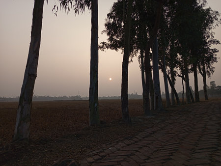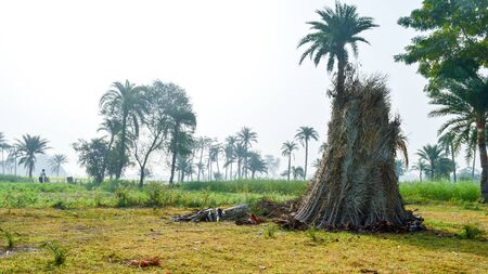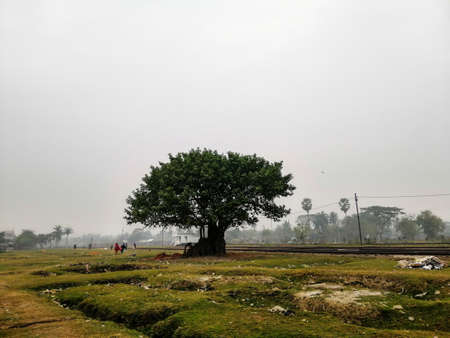 Green fields and trees in a scenic agricultural landscape in rural Bengal, North East India. A typical natural scenery with an agricultural field in the rural India depicting simple rural life.