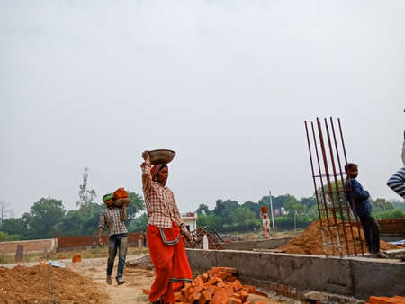 DISTRICT KATNI, INDIA - DECEMBER 18, 2019: An indian village lady labour transporting building material on head at home construction site.