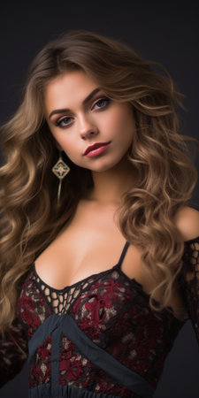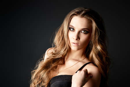 beautiful young woman with long curly hair posing on black background