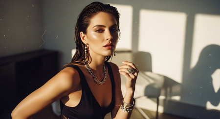 A beautiful woman posing in a stylish outfit with golden accessories