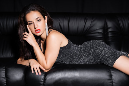 elegant woman in lurex dress and shiny earrings lying on leather couch and looking at camera isolated on black