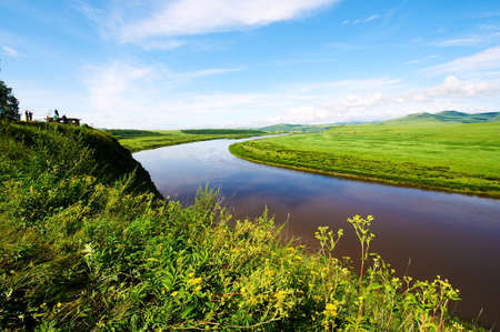 A panoramic view of rolling green hills stretches across the horizon under a vast, clear blue sky dotted with soft white clouds. A gentle river winds its way through the undulating landscape, its surface reflecting the sky and surrounding greenery. Scattered trees dot the hillsides, casting subtle shadows. The scene evokes a sense of peace, vastness, and natural beauty, characteristic of a serene rural countryside.