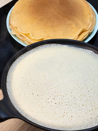 Closeup cooking pancakes on hot skillet. Cooking thin pancake on frying pan at the kitchen.
