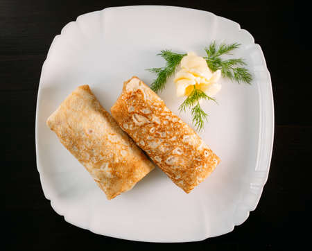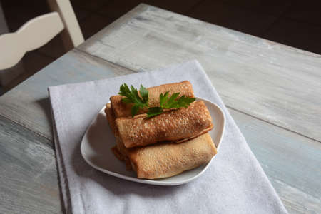Pancakes stuffed with meat, herbs. Russian or Ukranian cuisine.Homemade baking. Delicious lunch or supper