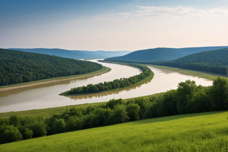 An aerial perspective reveals a winding river carving its path through a vast, dense green forest. The river's curves and meanders create a natural, organic pattern against the uniform texture of the tree canopy. Sunlight dapples through the leaves, highlighting the lushness of the vegetation. This serene and picturesque landscape showcases the untouched beauty of nature, evoking a sense of peace and tranquility. The scene is a testament to the intricate beauty of the natural