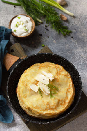 Thin Pancakes with Sour Cream Top View. Fresh Homemade Crepes