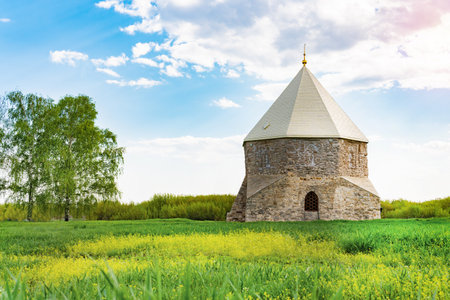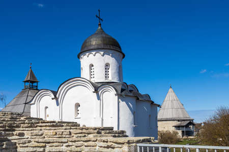 Staraya Ladoga, Russia - May 6, 2022: Church of St. George in Staraya Ladoga, XII century, ancient Church of Russia in fortress, river Volkhov, Novgorod Rus, Aldeigja, Varangians of Rurik,