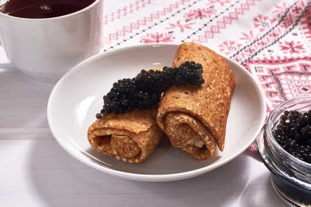 Pancakes with black caviar on a white wooden background. A traditional treat for Shrove Tuesday.