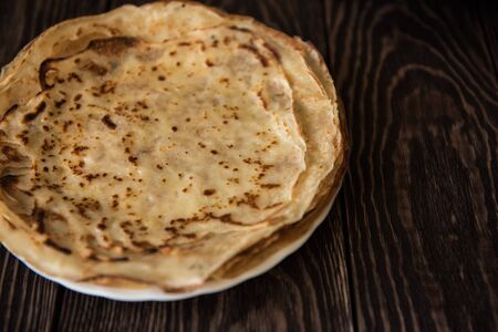 Stack of hot classic Russian thin pancakes. Rustic style. Traditional for the Russian pancake week - Maslenitsa. Close-up. Wooden spoon on the pancakes.
