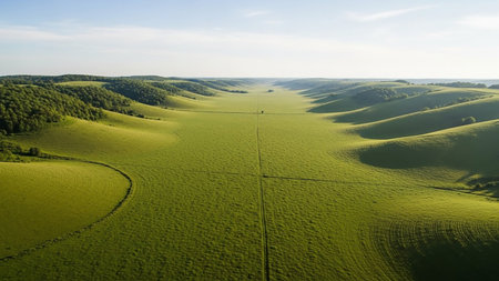 Parks/ showing rolling green hills and undulating landscape with winding dirt tracks under a bright blue sky with fluffy white clouds and soft sunlight casting...