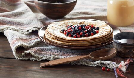 Pancake week hot cakes with berries, honey and butter on rustic background, closeup, copy space, shrovetide and homemade food concept