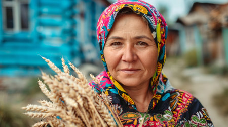 This stunning image showcases vibrant handcrafted textiles adorned with colorful flowers and intricate patterns, set against a rustic wooden backdrop.